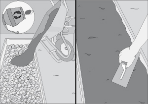 La primera capa tiene que ser el ripio, en una cama de 5 cm. Echar los sacos y esparcir con el rastrillo.