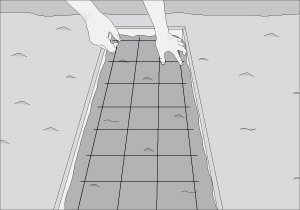 Mojar los pastelones y asentarlos sobre una cama de mortero de pega para baldosas, que sólo se prepara con agua. Los pastelones caben justo en los cajones, porque se hizo a la medida, pero si se tuviera que cortar alguno para calzar el largo se hace con un esmeril angular y un disco de corte para hormigón.