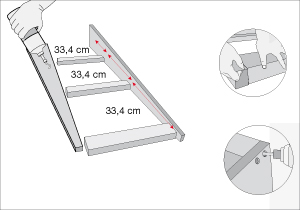 Para unir las 2 costillas de cada cuerpo se ponen primero 4 travesaños inferiores a una distancia de 33,4 cm a eje. Es muy importante hacerlos calzar con la esquina trasera y bordes rectos para no perder la inclinación de la rampa. Para fijarlos, se encolan las uniones, luego se avellanan 2 perforaciones y fija con tornillos de 1 5/8”.