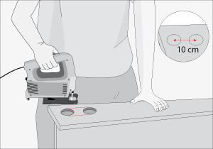 Para hacer los agujeros de las asas se puede usar una broca copa o sierra copa, un accesorio que se instala en el taladro, y que permite hacer perforaciones de mayor diámetro, traspasando por completo el espesor de la madera.
