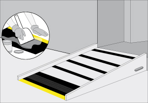 Para ayudar a que la rueda suba por la rampa y evitar que se deslice hay que poner goma en el borde inferior, que se pega con adhesivo doble contacto, esparcido con llana dentada en las 2 superficies. Además de cinta autoadhesivas antideslizante en el resto de la superficie.