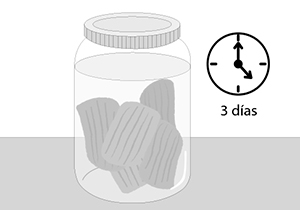 La técnica para envejecer la madera se debe preparar con anticipación. Hay que poner en un frasco con tapa las virutillas finas y verter encima el vinagre de vino blanco. Tapar y dejar reposar por lo menos 3 días.