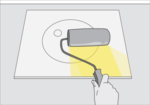 Echar pintura en una bandeja pequeña, untar el rodillo y pasarlo sobre la bandeja con la matriz.