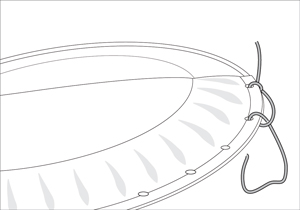 Con un hilo de cáñamo o yute que pase por las perforaciones, juntar las 2 partes del bolsillo. La forma de anudar es parecido a ponerle el cordón a las zapatillas: pasar el hilo por el agujero, dar una vuelta y de ahí a la siguiente perforación. Dejar sin hilo las primeras perforaciones de cada lado.
