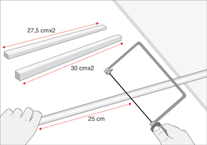 Cortar la barra, junquillo y cubrejunta con una sierra escolar. Primero la barra en 1 trozo que tenga un largo de 25 cm, después 2 trozos de junquillo de 30 cm, y finalmente 2 cortes de cubrejuntas a 27,5 cm.