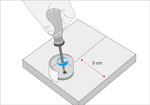 En los trozos de MDF que miden 10x10 cm hay que fijar los soportes, justo a la mitad, es decir a los 5 cm, y a tope con el borde, dejando el espacio para insertar la barra hacia arriba.