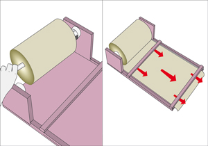 Pasar el rollo de papel por la barra de cortina y ponerla en los soportes. Pasar el papel por los cubrejuntas, que además permitirán cortar el trozo usado
