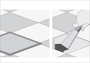La tarea más difícil es encontrar la palmeta vinílica que haga juego con las existentes. Le recomendamos que siempre mantenga una reserva de palmetas cuando las instale. Si no hay palmetas del mismo color tiene dos posibilidades: sacar una palmeta de un área poco visible, por ejemplo bajo el refrigerador, siempre y cuando pueda despegarla fácilmente, o idear un patrón con el modelo nuevo, usando palmetas de un color contrastante, aunque esto signifique sacar varias de las ya instaladas. Antes de intentar el cambio de palmetas, asegúrese de tener el recambio a mano.