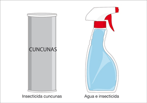 Echar agua en el pulverizador y mezcla con la cantidad de insecticida Cuncuna que indica el fabricante