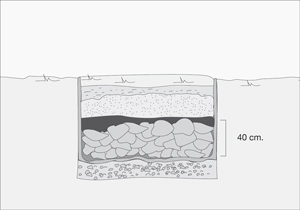 Haga un tratamiento de los sectores donde se encharca el agua. Delimitar el área, seccionar el pasto cuidando las raíces, y excavar hasta encontrar el ripio. Cubrir las paredes y el fondo con Geotextil, rellenar el hoyo con bolones hasta 40 cm. bajo el nivel del suelo, extiender un fieltro, agregar una capa de arena, después tierra y finalmente reponga la sección de pasto.