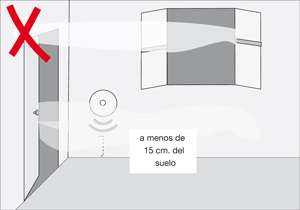 No situar el detector a menos de 15 cm. del cielo o del suelo, ni en zonas de turbulencias, como por ejemplo cerca de un ventilador de techo o junto a ventanas o puertas que permanezcan abiertas. La entrada de aire fresco podría retardar la detección del CO.