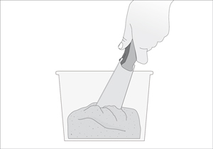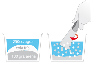 En un balde o bandeja de pintura hacer la mezcla de la arena, látex y cola fría, para revolver ayudarse de la espátula.
