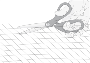 Con una tijera, cortar trozos de malla plástica de la medida interna de los cuadrados de PVC.