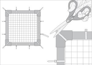 Utilizando amarras plásticas para cables (de un solo color o de distintos colores) fijar la malla a la estructura.