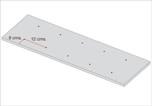 Hacer 10 marcas en el trozo de madera A, cada una a 12 cms de distancia y desde el borde a 9 cms.