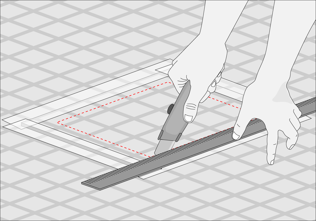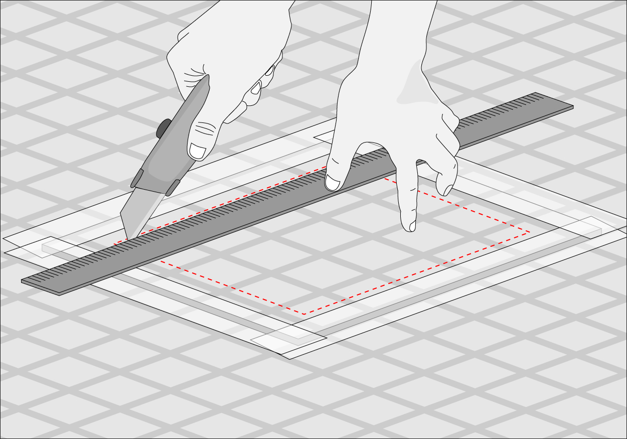Con una regla metálica y un cuchillo cartonero con buen filo, cortar cuidadosamente ambas capas del linóleo.