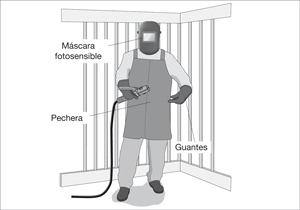 La ropa para soldar está fabricada con cuero de descarne, es un material incombustible que resiste las salpicaduras y chispas. Es indispensable tener una máscara y chaqueta, o en su defecto, pechera y guantes largos.