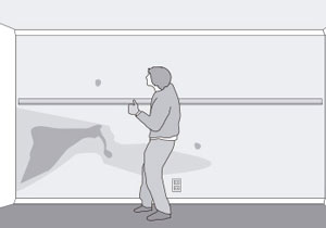 - Una vez puesto el adhesivo en los paneles, se levantan contra la pared y se presionan con una regla de aluminio, ejerciendo la presión de forma pareja y uniforme.