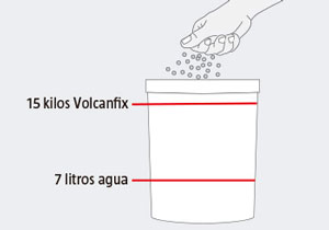 Echar en una tineta 7lt de agua x 1 saco de 15kg de Volcafix Echar el agua, espolvorear de a poco l pegamento con la mano, dejar remojar 3 minutos antes de revolver.