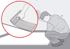 - En desaplomes menores a 10mm se debe aplicar de forma continua con llana dentada (dentada de 9mm para desaplomes de hasta 6mm y dentada de 13 mm para desaplomes de 6-10 mm). Para desaplomes entre 10-20 mm el adhesivo se debe aplicar mediante motas al panel.