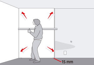 - Poner unas cuñas en el piso de 15 mm para dejar la separación necesaria, apoyar las planchas en las cuñas y levantarlas hacia el muro.