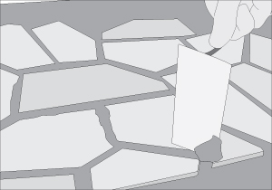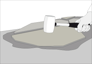 Comenzar por la zona más lejana a la salida, para no tener que pisar las piedras recién instaladas. Presentar en el suelo las primeras palmetas que se van a pegar, esto se hace para calcular la zona que hay que cubrir con el adhesivo, como es de secado rápido, no se quiere cubrir mucha extensión ya que se secaría en el proceso.