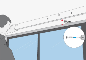 Presentar la viga trasera en el muro a 10 cm desde el borde de la ventana. Hay que ayudarse de otra persona porque es muy importante que quede nivelado. Las perforaciones en el muro se hacen con un rotomartillo y una broca M12 para hacer una perforación de 11 cm de profundidad.