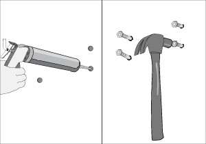 Para dar firmeza a los pernos hay que usar un adhesivo de anclaje. Primero hay que eliminar todo el polvo dentro del agujero, y aplicar el adhesivo con pistola calafatera. Se pone el perno, golpeándolo hasta que quede todo el hilo dentro. Pero todavía no hay que colgar el marco, ya que hay que esperar 2 horas hasta que el adhesivo haya fraguado.
