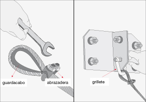 Para colgar los cables en las uniones de viga, se tiene que formar una argolla en el extremo del cable que va cerrada con una abrazadera. Pero es muy importante proteger el cable con un guardacabo, así no se dañará con el roce.