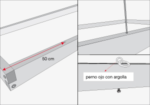 En las vigas perpendiculares del marco el cable irá fijo a partir de un perno con ojo y argolla que se fija a 50 cm desde los extremos y a eje de la madera. Se hace la perforación con una broca de paleta larga, que tiene 10 mm de diámetro y 40 cm de profundidad. Después se pone el perno con ojo y argolla, y se fija con golillas y tuercas.
