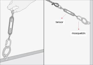 Después del perno con ojo hay que poner un mosquetón o unión rápida y un tensor. Este elemento lo que hace es regular la tensión de los cables, para que queden más sueltos o más rígidos. Esto es fundamental para que el cobertizo quede levantado.