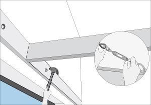 Entre 2 ó más personas colgar la viga trasera del marco en los pernos de anclaje, y apretar hasta que quede firme. Para dar rigidez a los cables hay que girar los tensores para distribuir las cargas de manera uniforme.