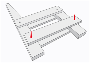 Las 2 tablas de 48 cm que van más arriba se fijan en la pata delantera a ras con su borde. Pero en la trasera hay que bajar 2 cm, es decir fijarlas a los 38 cm desde el suelo. Esto es importante para dar inclinación al asiento. Y las otras 2 tablas de 48 cm, que van más abajo, se fijan en la pata delantera a 10 cm del suelo y en la trasera a 8 cm del suelo.
