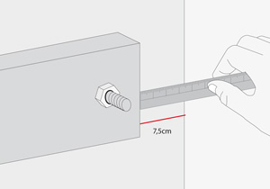 Hacer la mezcla de los 2 componentes del adhesivo de anclaje, poner un poco en el extremo del perno e introducirlo en el agujero. Golpear con un martillo hasta que esté bien embutido. Pasar la viga por el perno, meter la tuerca y apretar con la llave ajustable.