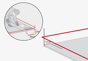 Medir desde el borde del muro hasta donde comienza la viga, por ejemplo 7,5 cm. Para calcular la posición del pollo hay que traspasar esta medida desde la lienza hacia dentro del espacio del cobertizo.