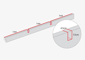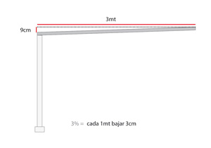 La regla para calcular la pendiente de un cobertizo o pérgola de terraza establece que la caída tiene que se de un 3%. Esto quiere decir que cada 1 mt o 100 cm de techumbre, hay que bajar 3 cm. Por ejemplo en una techumbre que mide 3 mt se tiene que multiplicar por 3, eso da un total de 9 cm que hay que descontarle a los pilares para que queden más bajos que la viga que va al muro.