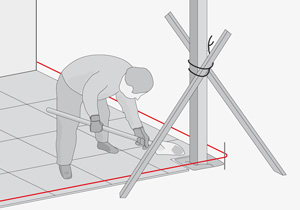 Poner lienzas que marquen el ancho y largo del cobertizo, estas lienzas deben seguir la línea del muro, y por el frente llegar hasta donde se quiera el ancho. Se amarran a estacas enterradas en la tierra.
