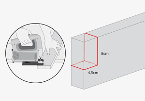Hacer un primer calado a las 3 vigas principales, que son tablas de 2x6”, para que se pueda encajar en la viga que va al muro. Va justo en el extremo, con un largo de 8 cm y un ancho de 4,5 cm. Se cala con sierra, procurando que la hoja sea más larga que el espesor de la madera.