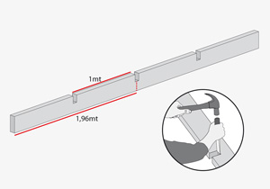 Esta viga que es de 2x8” va a ir pegada al muro de la casa, y va a cumplir un importante rol de apoyo del cobertizo. Antes de fijarla hay que hacerle unos calados, para después afirmar 3 vigas perpendiculares. Son 3 calados en la viga. El primero va al centro, justo al eje (en el caso de este proyecto 1,96 mt, pero variará según el ancho de su cobertizo) y los otros a 1 mt hacia los extremos, desde ese eje. Cada calado mide 4,5 cm de ancho y 6 cm de largo