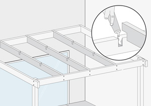 Para el montaje, además de hacer calzar los calados, hay que fijar un tornillo tirafondo con cola fría para que quede más firme. Echar cola fría en los calados que unen las vigas principales con la viga del muro, atornillar con un tirafondo. Después fijar las uniones sin calados, es decir las que van en el marco de la techumbre, esto se hace con 2 fijaciones, perforando con broca de 8 mm y pasando un tornillo tirafondo, que se ajusta con llave chicharra y ajustable.