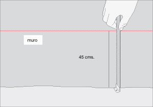 Determinar el desnivel que se le va a dar al piso para que el agua pueda escurrir. En este caso, se hará una pendiente de 1 cm por cada metro. Es decir, 2 centímetros de pendiente en total, a lo ancho. Hacer una marca a cualquier altura en el muro. En este caso, 45 cms.