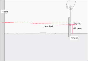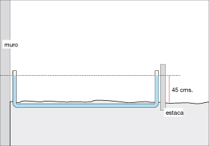 Cuando se ha estabilizado el nivel del agua, se realiza la marca en el segundo punto que será exacta y equivalente a la medida que está en la primera marca, es decir, 45 cms. Pero como queremos que quede un desnivel de 2 cms, se marca a los 43 cms en las estacas. La nivelación natural que busca el agua ayuda a conseguir con exactitud la misma altura en todos lados.