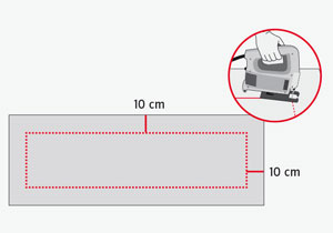 En las piezas que será los frentes de los muebles lavaplatos y encimera hacer un calado interior dejando un borde de 10 cm por todo el contorno. Se hace un agujero con broca para madera que permita introducir la hoja de la sierra y hacer el corte.
