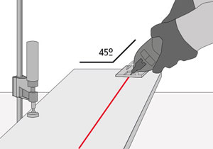 Un trozo de MDF de 30cm por el largo interior del mueble hay cortarlo a lo largo para tener 2 trozos de 15 cm de ancho. El corte se debe hacer con la sierra caladora moviendo su hoja en un ángulo de 45º.