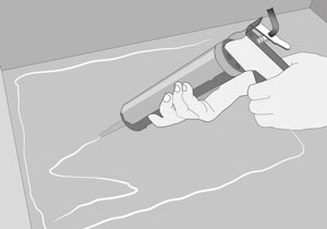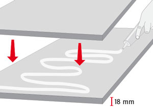 Con silicona y la pistola calafatera pegar las cubiertas de terciado sobre la base de los muebles de MDF. La silicona se aplica en la base de MDF por todo el borde y en el interior en forma de zigzag. Se monta encima la cubierta de terciado y se presiona para que entren en contacto.