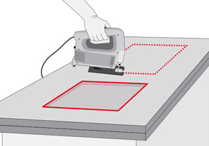 En la cubierta de la cocina encimera hacer el calado correspondiente al tamaño de la encimera. Hacer agujero con broca, introducir la hoja de la sierra y calar.