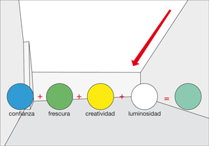 Para pintar el cielo, usaremos a nuestro favor su inclinación, es por ello que le daremos un color distinto. Haremos una combinación usando la “sicología del color” lo que nos dará como resultado un tono “mar del caribe” Para lograr este color mezclaremos verde, que otorga frescura; azul, que evoca confianza; amarillo, que tiene relación con la creatividad; y blanco, que le da luminosidad.