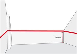 Vamos a dividir los muros de manera horizontal, trazando una línea a 70 cm del suelo. Haremos esto por tres razones: a) para que la combinación de colores otorgue profundidad. b) para fijar una altura a la medida del niño y c) para no exponer el blanco de la pared a la rutina del pequeño, por ello utilizaremos un color gris porque así la suciedad se nota menos.