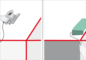Para pintar las paredes, las dividiremos horizontalmente en dos. Esto lo conseguimos enmascarando a 70 cm desde el suelo. En este caso no vamos a tizar para no manchar el blanco superior. Antes de pintar debemos lijar la superficie para eliminar imperfecciones y otorgar mayor adherencia para la nueva pintura.
