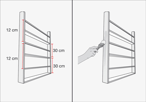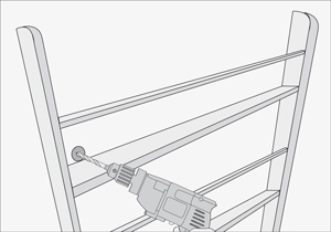 Fijar cada 30 cms tablas de 4x1” de forma horizontales a los soportes laterales. Estos serán los niveles del librero. clavar los junquillos a 12 cm de cada repisa, de esta forma evitaremos que los libros se caigan. Pintar con Primer y una vez seco, aplicar esmalte al agua gris semibrillo.